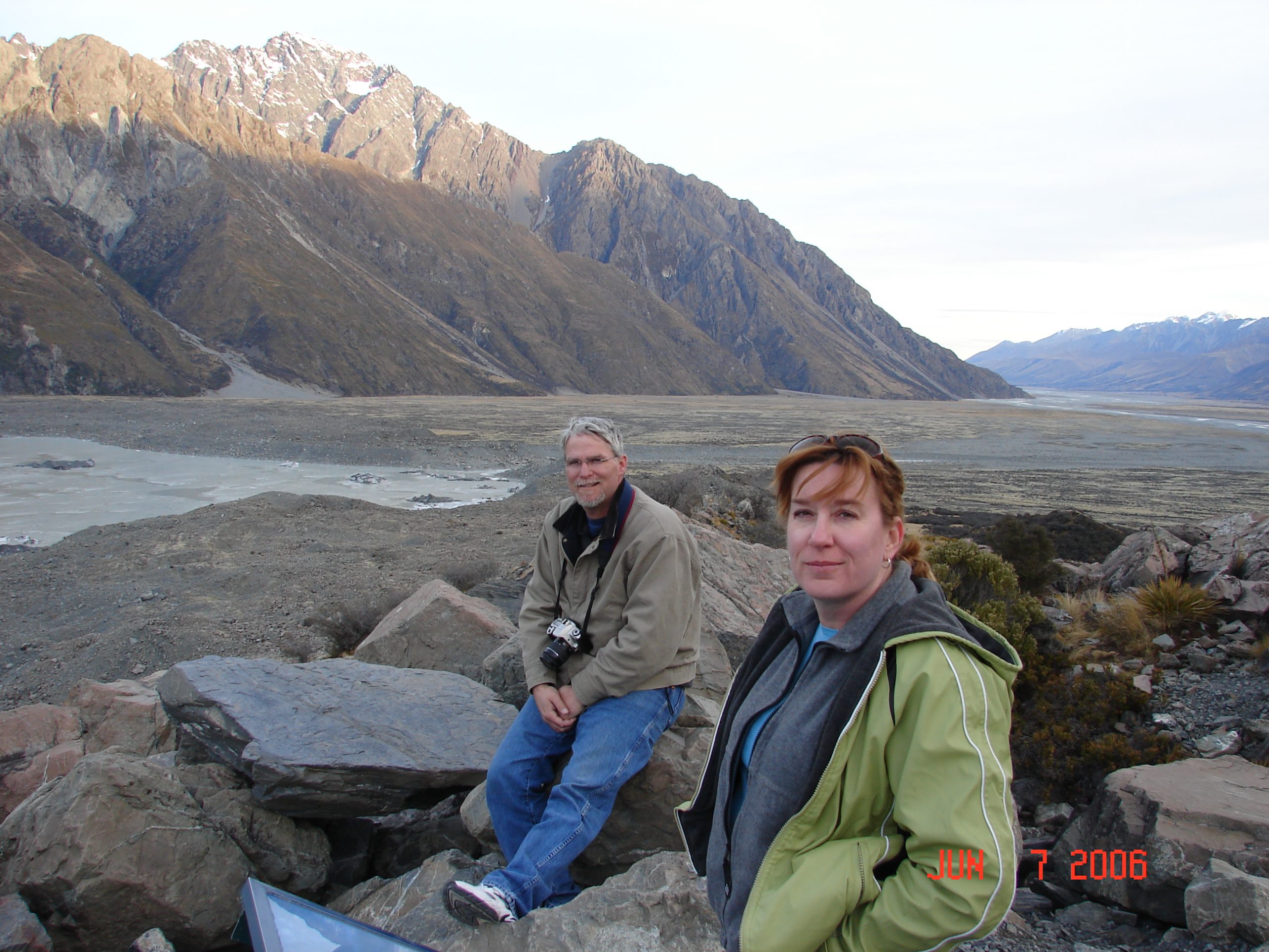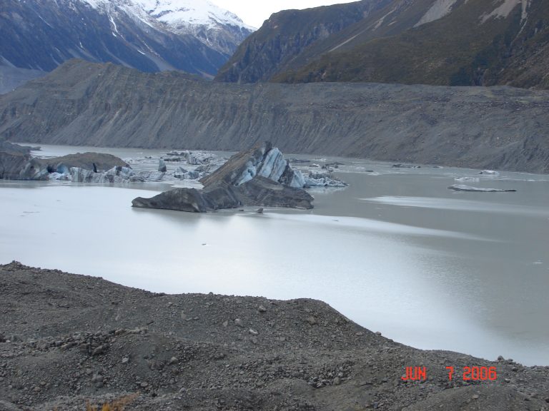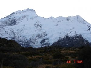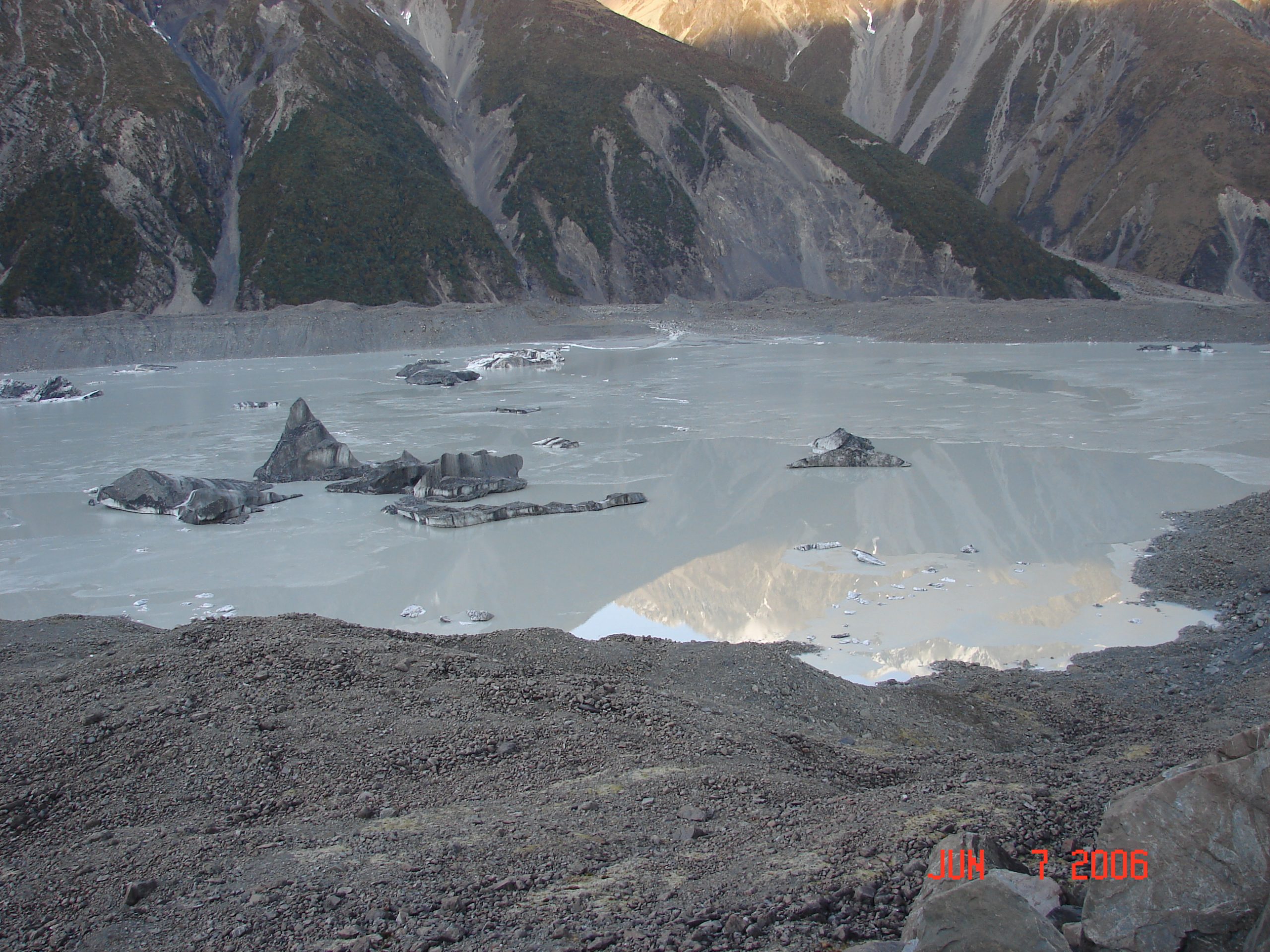 The ice from the end of the Tasman Glacier broke off and floated in this lake. It was very cold and still and we had a good view of the mountains reflecting in the lake.