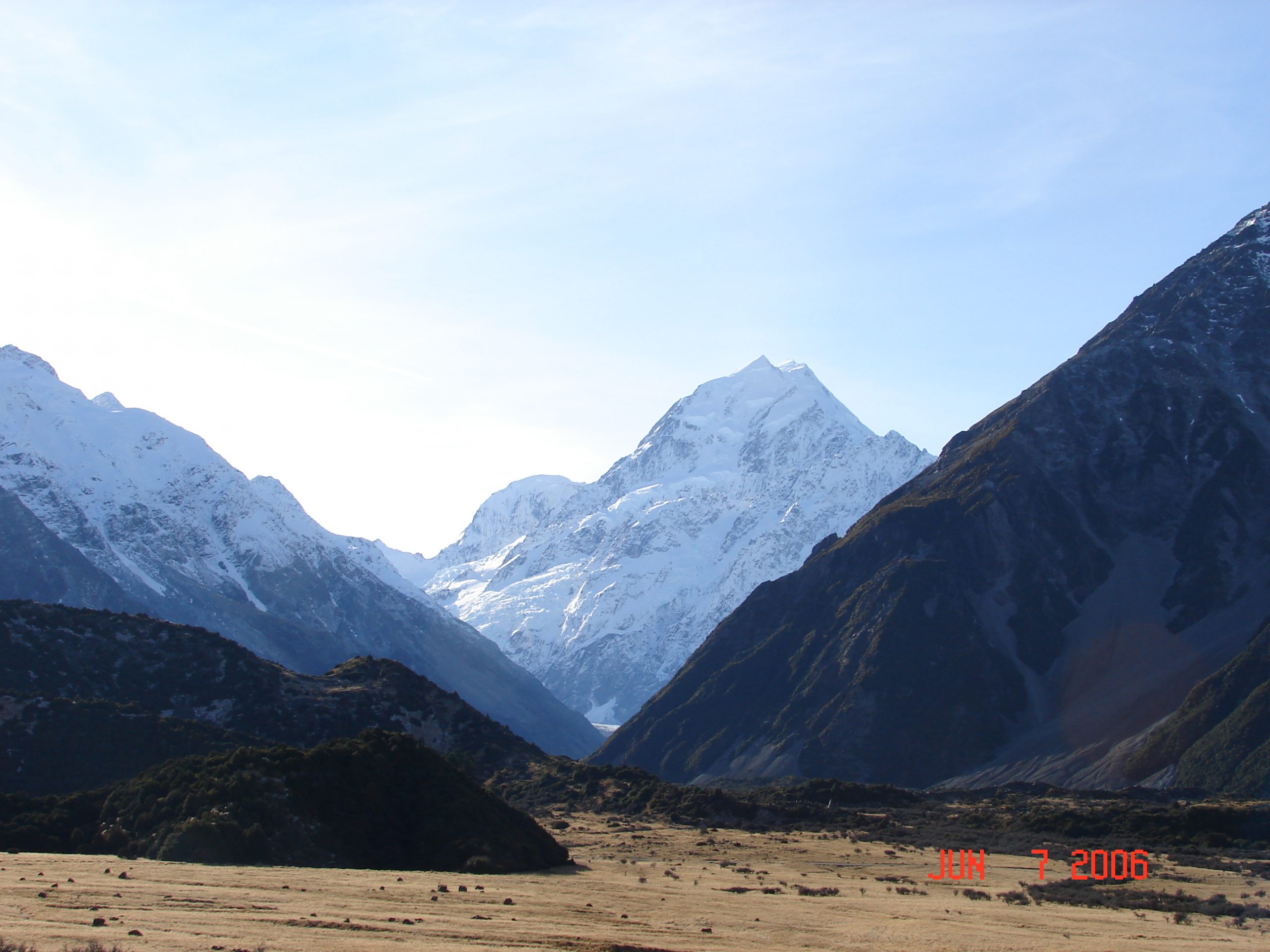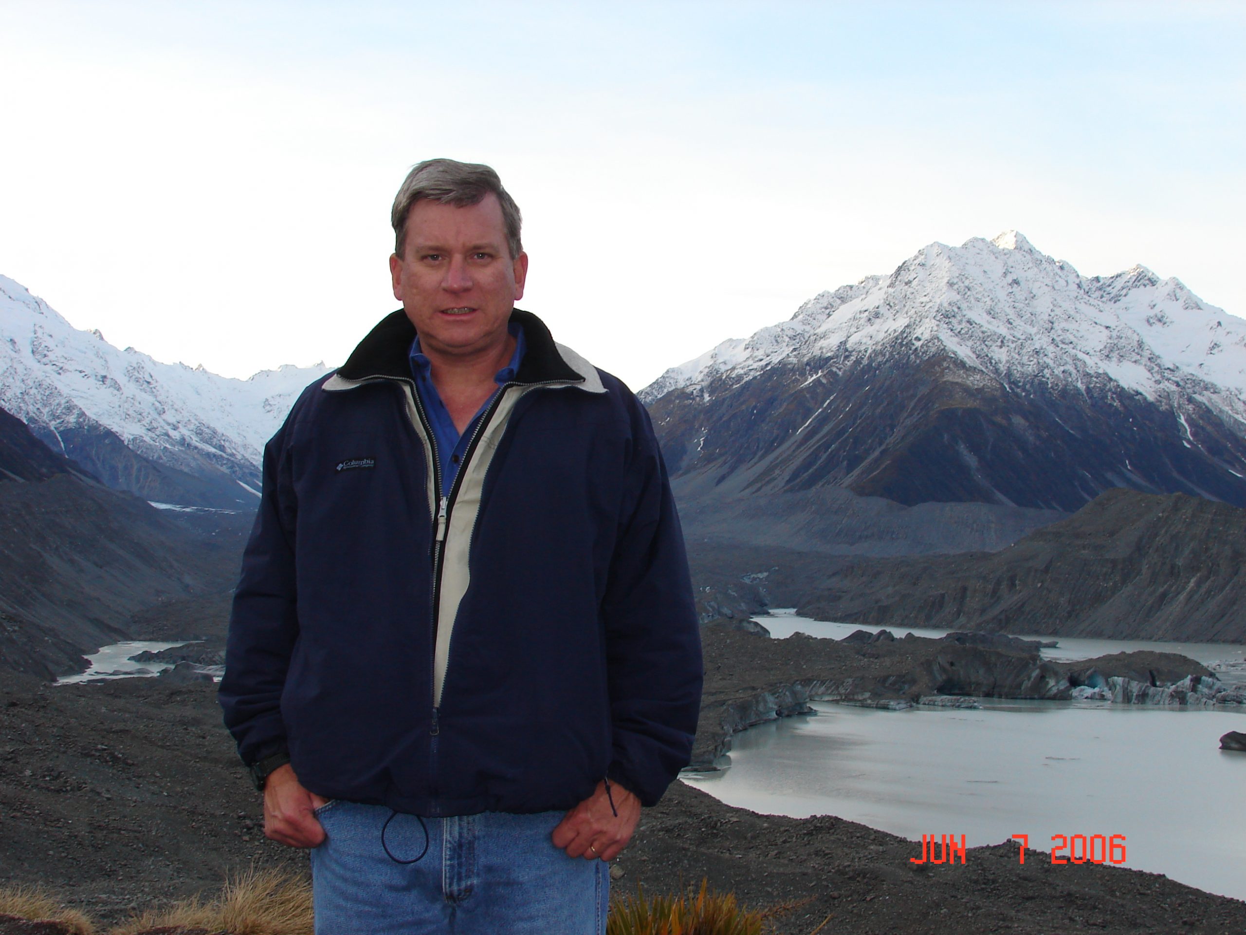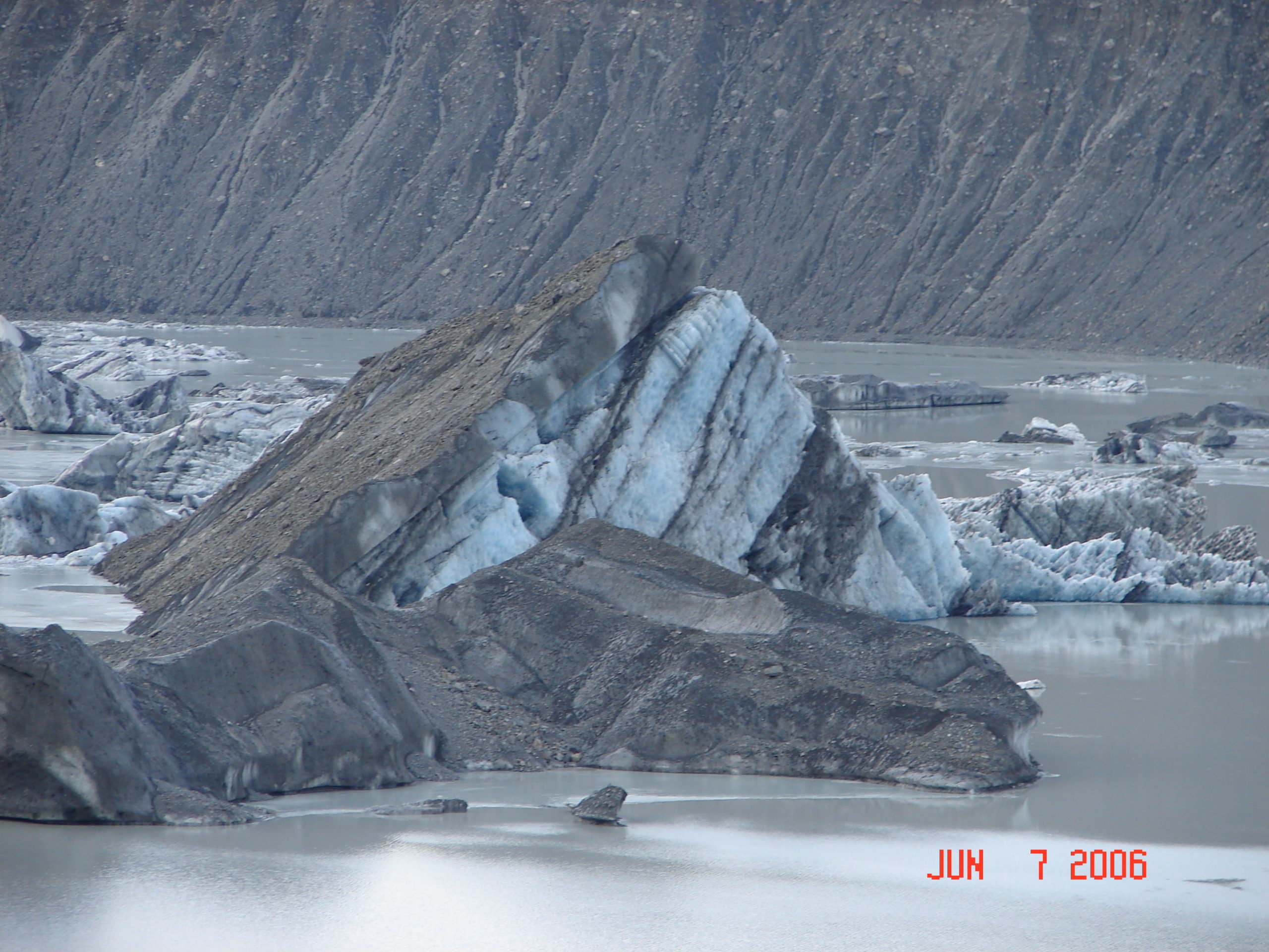 The ice from the end of the Tasman Glacier broke off and floated in this lake. It was very cold and still and we had a good view of the mountains reflecting in the lake.
